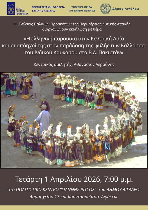 Η εκδήλωση, με θέμα «Η ελληνική παρουσία στην Κεντρική Ασία και οι απόηχοί της στην παράδοση της φυλής των Καλλάσσα του Ινδικού Καυκάσου στο Β.Δ. Πακιστάν», θα πραγματοποιηθεί την Τετάρτη 1 Απριλίου 2026 και ώρα 19:00, στο Πολιτιστικό Κέντρο «Γιάννης Ρίτσος» (Δημαρχείου 17 & Κουντουριώτου).