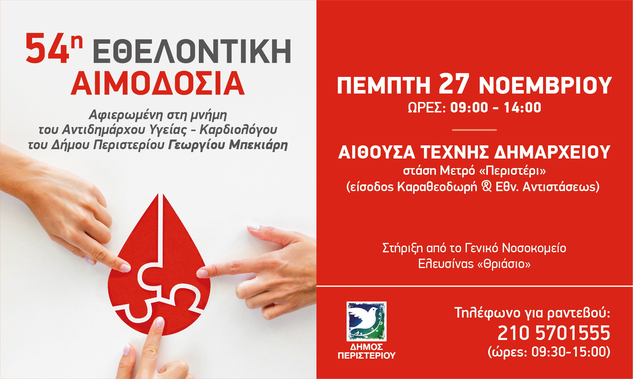 Ο Δήμος Περιστερίου διοργανώνει την 54η Εθελοντική Αιμοδοσία, την Πέμπτη 27
