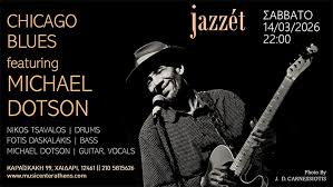 Το Jazzèt Music Hall υποδέχεται το Σάββατο 14 Μαρτίου, για μία ακόμη φορά μετά τις sold out εμφανίσεις του, έναν από τους πιο αυθεντικούς εκφραστές του Chicago Blues: τον εκρηκτικό κιθαρίστα, τραγουδιστή και συνθέτη Michael Dotson. Μια βραδιά ατόφιου “house-rockin’ blues”, με ένταση, groove και ατμόσφαιρα κατευθείαν από τα ιστορικά blues clubs του Σικάγου.