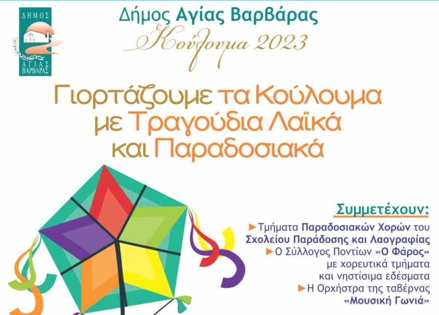 Ο Δήμος Αγίας Βαρβάρας γιορτάζει παραδοσιακά τα Κούλουμα την Καθαρά Δευτέρα (φέτος στις 23 Φεβρουαρίου 2026) στο Άλσος Μητέρας με Σαρακοστιανά εδέσματα: Προσφορά λαγάνας, φασολάδας και άλλων νηστίσιμων στους παρευρισκόμενους.